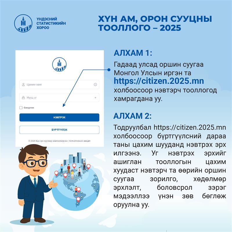 Иргэн Та http://citizen.2025.mn холбоосоор орж, бүртгүүлсний дараа Таны бүртгүүлсэн цахим шууданд нэвтрэх нууц үг ирэх бөгөөд тус нууц үгээр http://citizen.2025.mn цахим хуудсанд нэвтэрч өөрийн мэдээллийг оруулж, Хүн ам, орон сууцны завсрын тооллогодоо идэвхтэй хамрагдахыг уриалж байна.